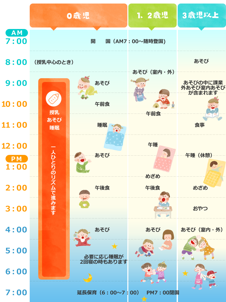 0歳児の頃は一人ひとりの日課に合わせた食事や睡眠をとるようにしています。 乳児から幼児については、年齢に応じて日課を整えていきます。 特に幼児なると自分たちで生活を作っていく部分(仕事も含め)も、多くなります。